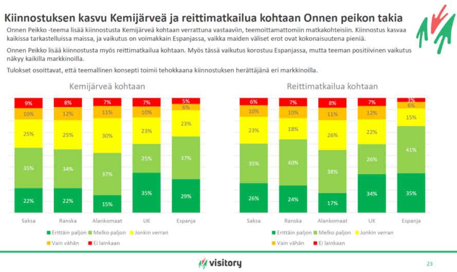 Kun Onnen Peikko -teema oli hahmoteltu riittävän pitkälle, haluttiin tietysti selvittää, onko sillä minkäänlaista potentiaalia matkailijoiden houkuttelemiseksi Kemijärvelle. Mielipiteitä kyseltiin tapahtumissa, matkailukohteissa ja verkossa. Kaikissa kyselyissä Onnen Peikko -teema koettiin selvästi hyväksi tavaksi erottua muista kohteista. Sen lisäksi teetettiin Visitory Oy:llä kansainvälinen markkinatutkimus viidessä maassa tärkeimmillä reittimatkailukohderyhmillä. Vastaajia oli kaikkiaan 1899 reittimatkailusta kiinnostuneista kohderyhmistä. Kyselyssä selvitettiin, lisääkö Onnen Peikko -teema kiinnostusta matkustaa Kemijärvelle. Tulokset olivat häkellyttävän hyvät. Visitory Oy:n edustajan mukaan tulosten positiivisuus yllätti hänetkin.