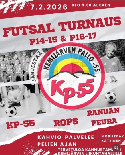 Futsal-turnaus liikuntahallilla P14-15 ja P16-17. 7.2.2026 klo 9:30-19:00 Mukana KP-55, RoPs ja Ranuan...