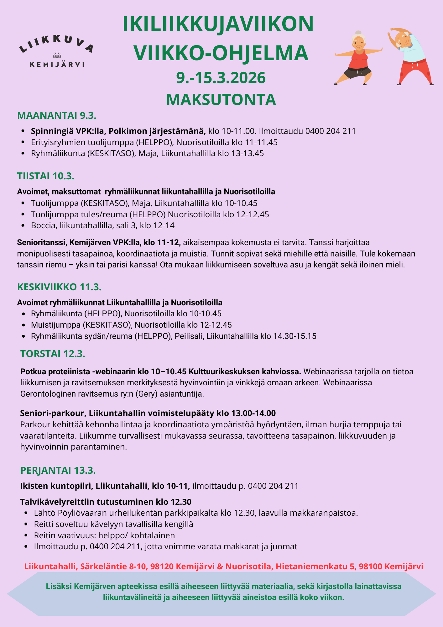 Ikiliikkujaviikko Kemijärvellä viikolla 11, viikko-ohjelma 9.-13.3.