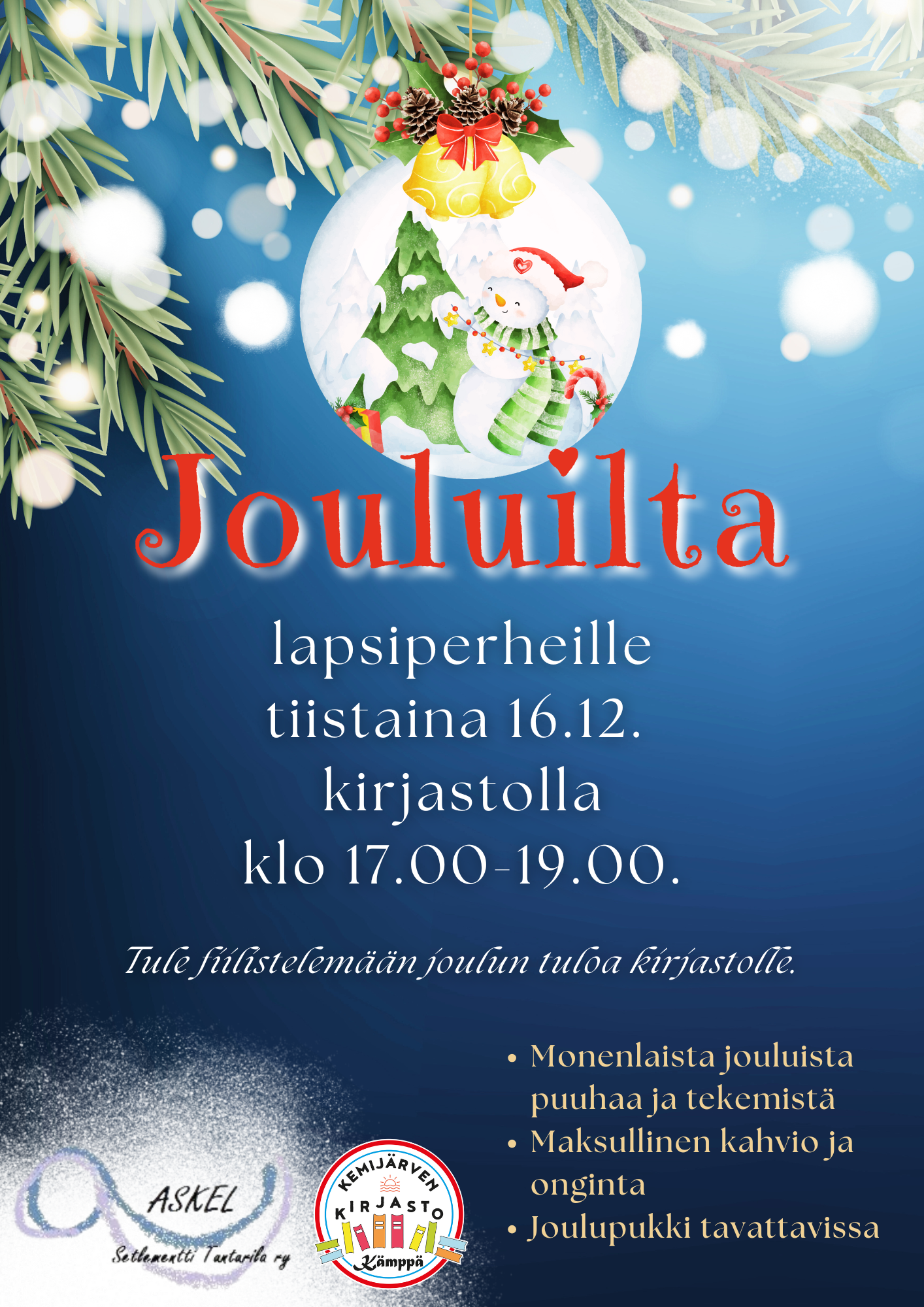 Jouluilta lapsiperheille tiistaina 16.12. klo 17.00-1900 Kemijärven kirjastolla. Tule fiilistelemään joulun tuloa! Monenlaista...