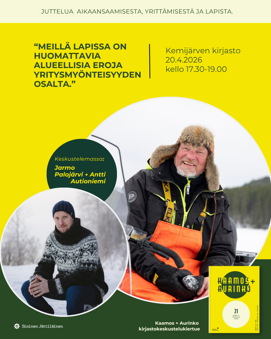 Kemijärven kirjastossa syvennytään maanantaina 20. huhtikuuta lappilaiseen tekemisen kulttuuriin, yrittäjyyteen ja elämänmuutoksiin. Kaamos+Aurinko -kirjastokiertue tuo yhteen ammattikalastaja Jarmo Palojärven ja kustantaja Antti Autioniemen keskustelemaan pohjoisen elinvoimasta ja omien polkujen raivaamisesta.