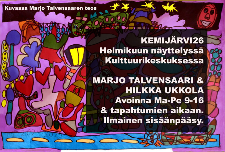 Marjo Talvensaaren ja Hilkka Ukkolan yhteisnäyttelyn avajaiset. Hajusteyliherkkyyden takia toivomme, ettei tilaisuuteen tulijoilla olisi hajusteita (parfyymit ym.).