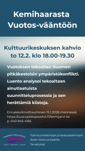 Sijainti: Kemijärven kulttuurikeskuksen kahvio, Hietaniemenkatu 5