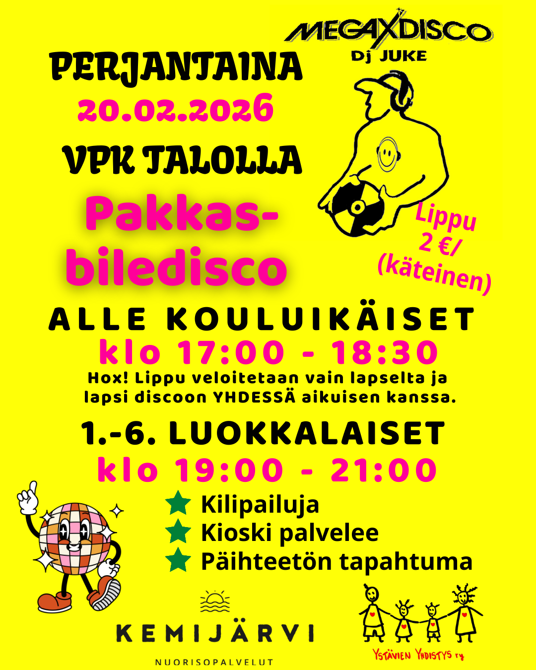 Pakkasbiledisco 1.-6. luokkalaisille perjantaina 20.2. klo 19.00-21.00 VPK:n talolla