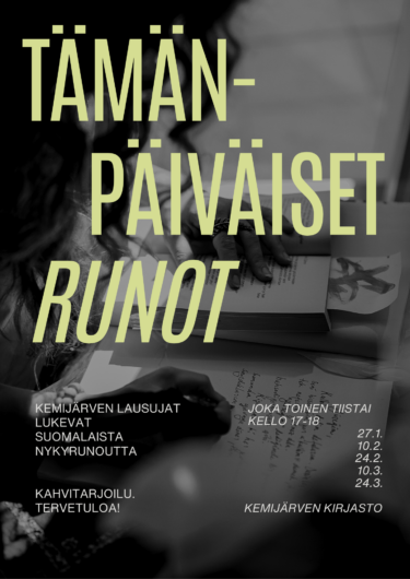 Ti 10.2. Kemijärven Lausujat kutsuvat kaikkia kuulemaan ”Tämänpäiväisiä runoja” Kemijärven kirjastoon kello 17-18.