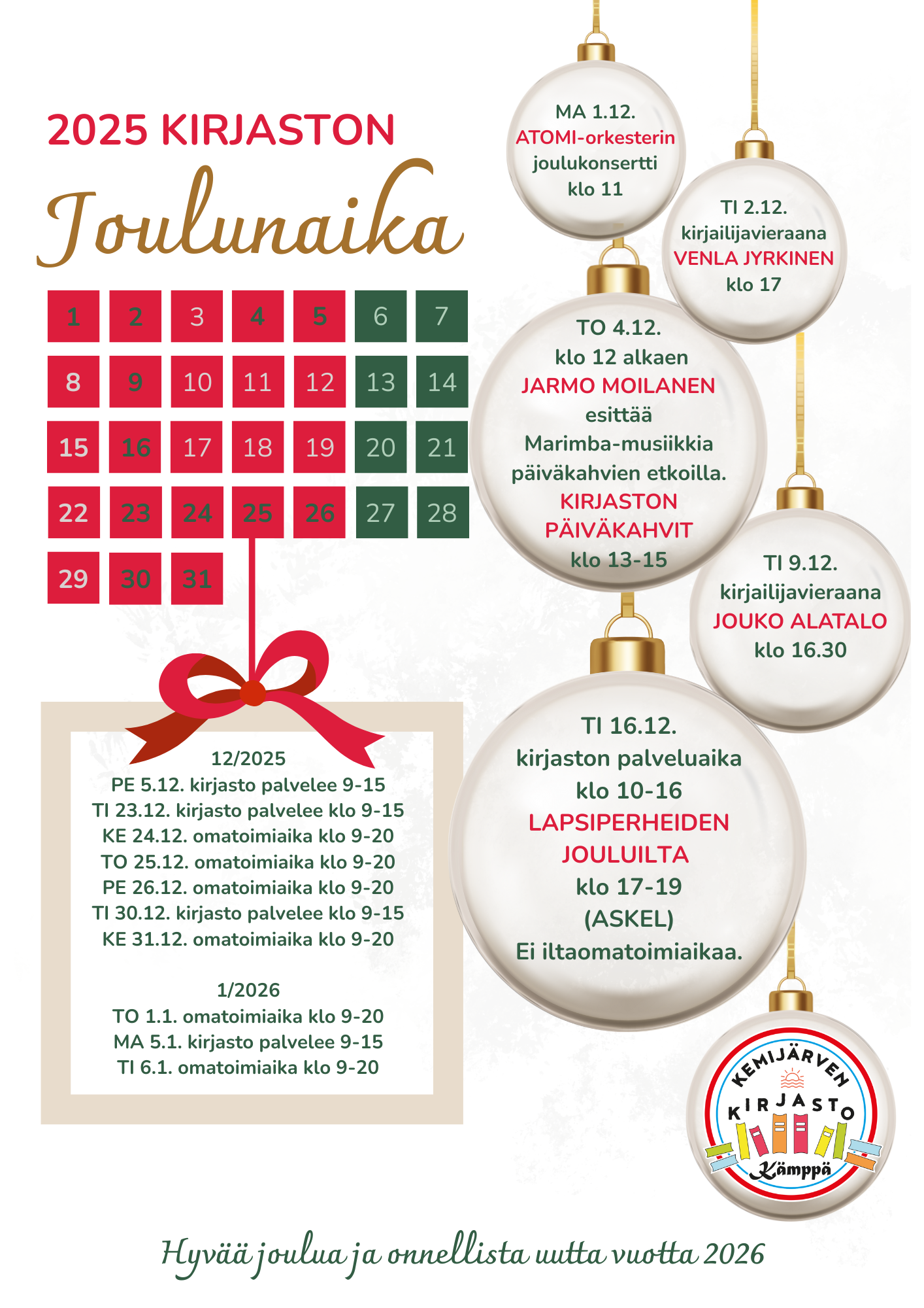 Tiistaina 16.12. kirjasto suljetaan klo 16.00 eikä illan omatoimiaika ole käytössä.