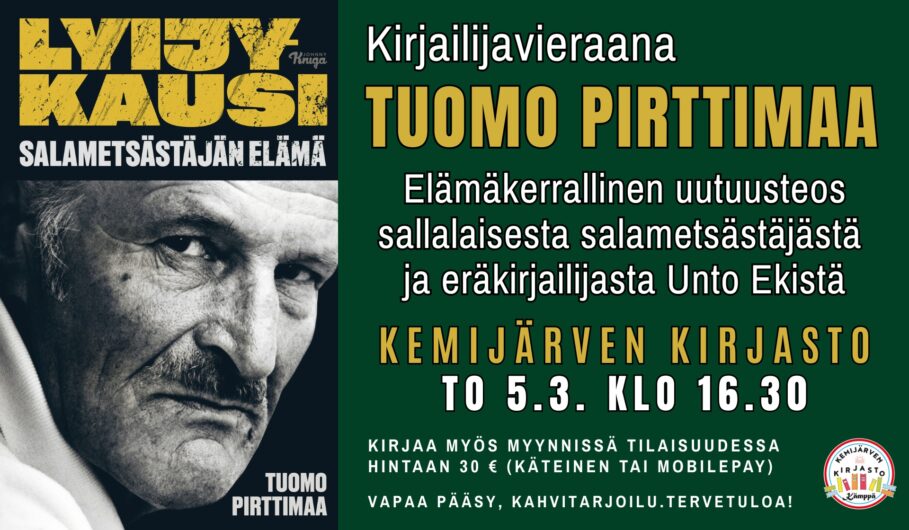 To 5.3. klo 16.30. Kirjailijavieraana salametsästäjä Unto Ekin elämästä romaanin kirjoittanut Tuomo Pirttimaa