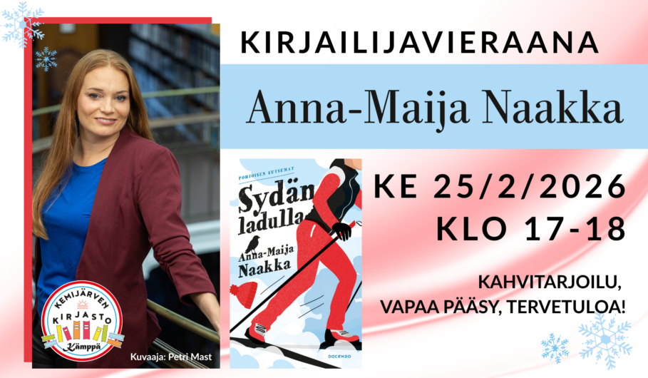 Sydän ladulla (Docendo 2026) on toimittaja Anna-Maija Naakan esikoisteos joka aloittaa kolmen siskon suhdekiemuroista kertovan Pohjoisen kutsumat -viihdesarjan. Kirjailija kertoo vierailullaan kirjan synnystä ja kirjoitusprosessista. Hän kirjoittaa parhaillaan tälle jatko-osaa, jossa myös Kemijärvi on esillä.