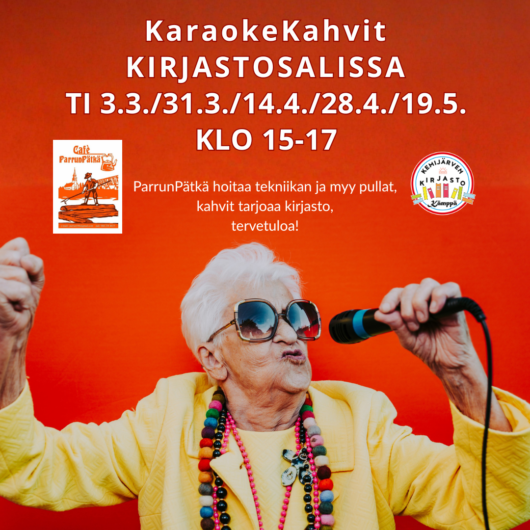 Karaokekahvit kirjastolla, Parrunpätkä myy pullat ja hoitaa tekniikan, kirjasto tarjoaa kahvit. Tervetuloa!